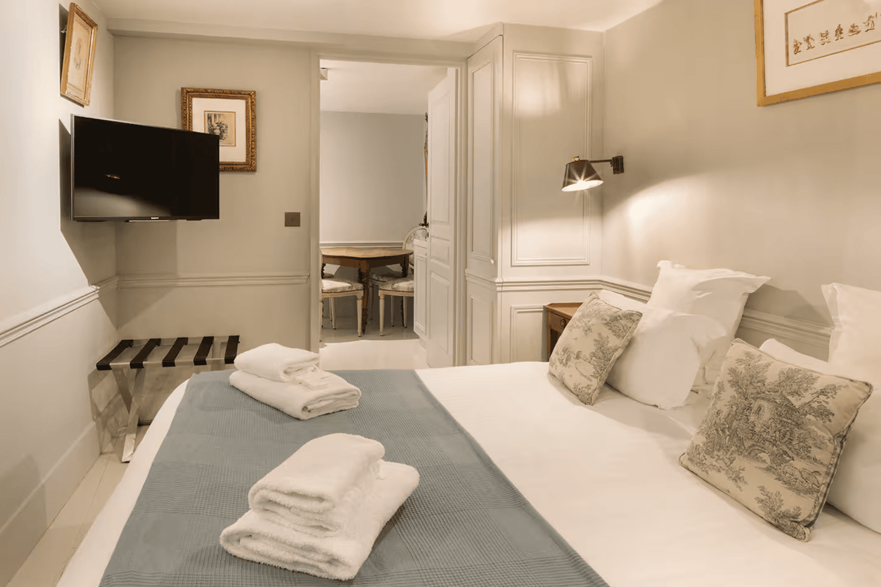 Discover this elegant one-bedroom apartment, thoughtfully designed to offer a refined and comfortable Parisian stay. Decorated in a timeless French style with a modern touch, the apartment features a Queen-size bed and a high-quality double sofa bed, accommodating up to four guests with ease. A sleek and modern bathroom completes the space. Located on the ground floor, the apartment is filled with natural light and soft tones, creating a calm and inviting atmosphere. The living area includes a fully equipped kitchen, a dining space, and a cosy lounge perfect for relaxing after a day in the city. The separate bedroom offers the feeling of a private Parisian residence, with generous storage, a connected TV, and a peaceful ambiance. To ensure optimal comfort, the apartment is equipped with hotel-quality linens and towels, a Nespresso coffee machine, high-speed Wi-Fi, a flat-screen television, and a selection of welcome amenities. Please note: The booking link directs you to the Pick A Flat agency website, where your reservation will be completed securely through their service